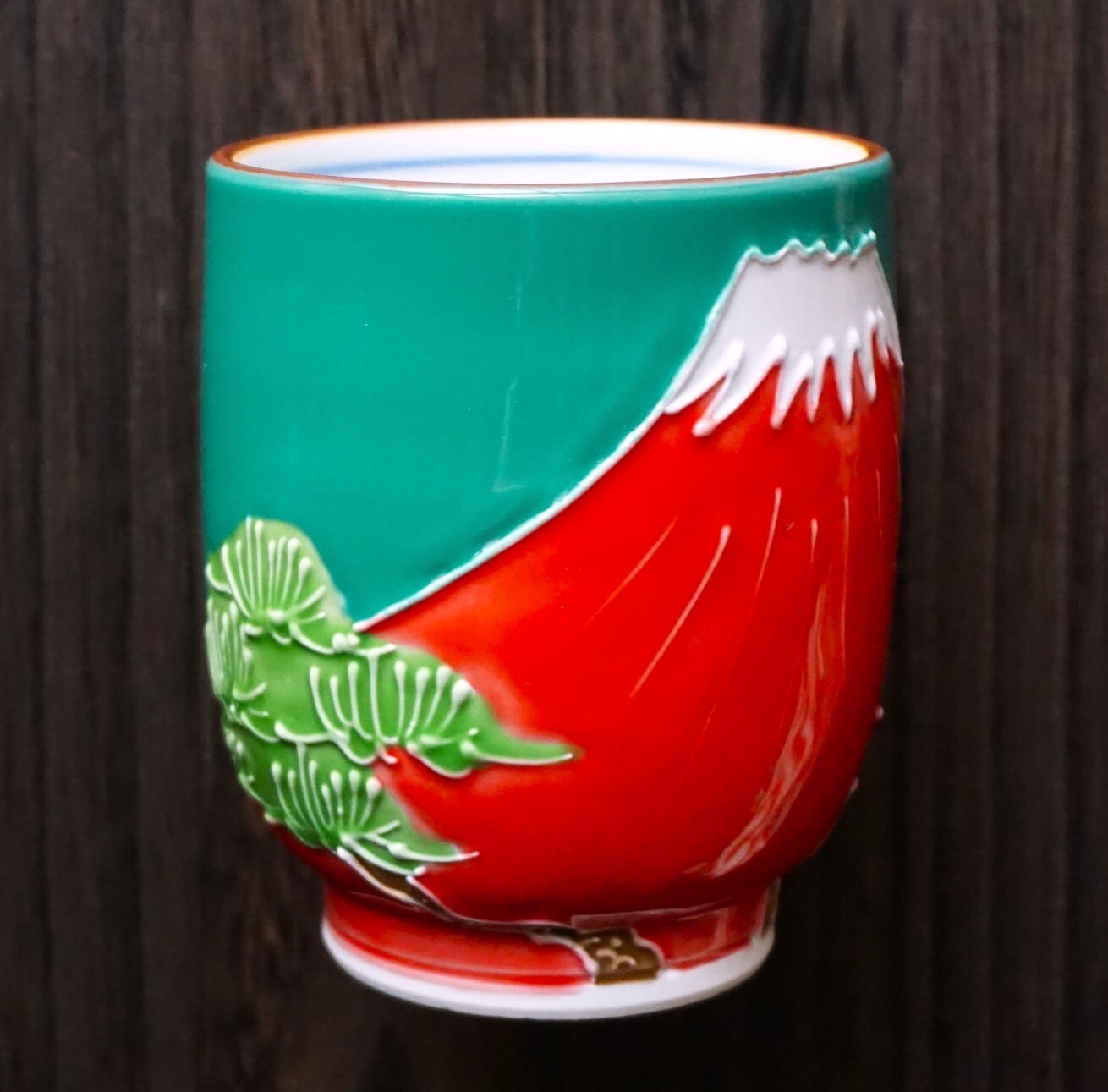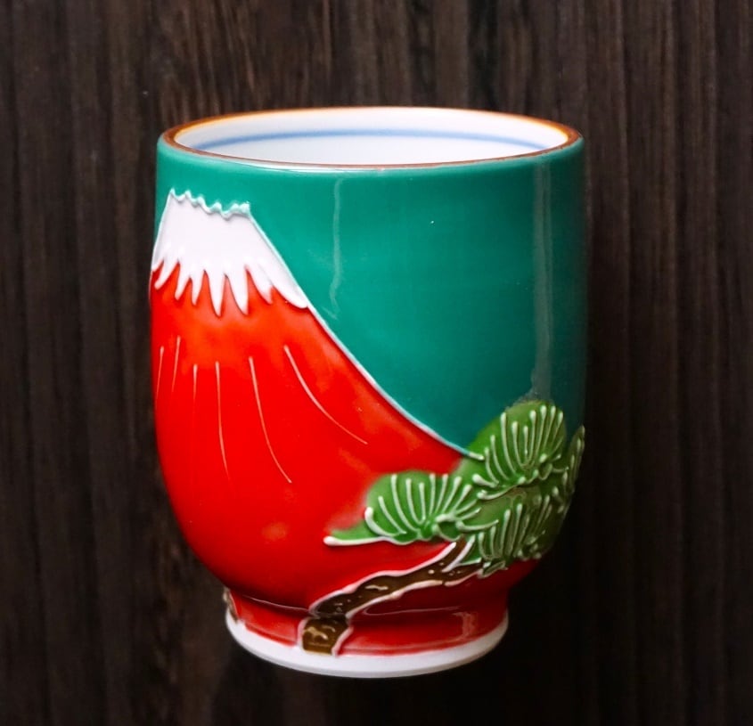 きりりとそびえ立つ赤富士と松の絵付けが美しい湯吞です。